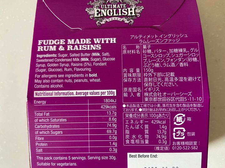 ラム酒が入った大人向けのお菓子。原材料を見て想像がつきますが、カロリーはとても高いです。