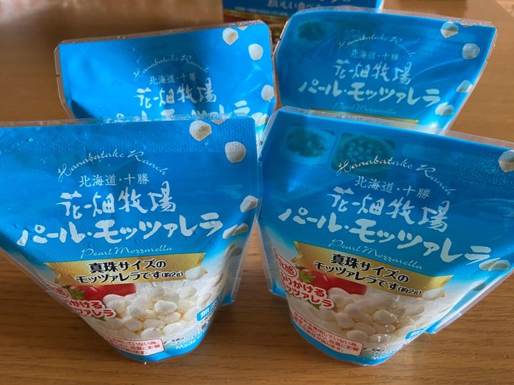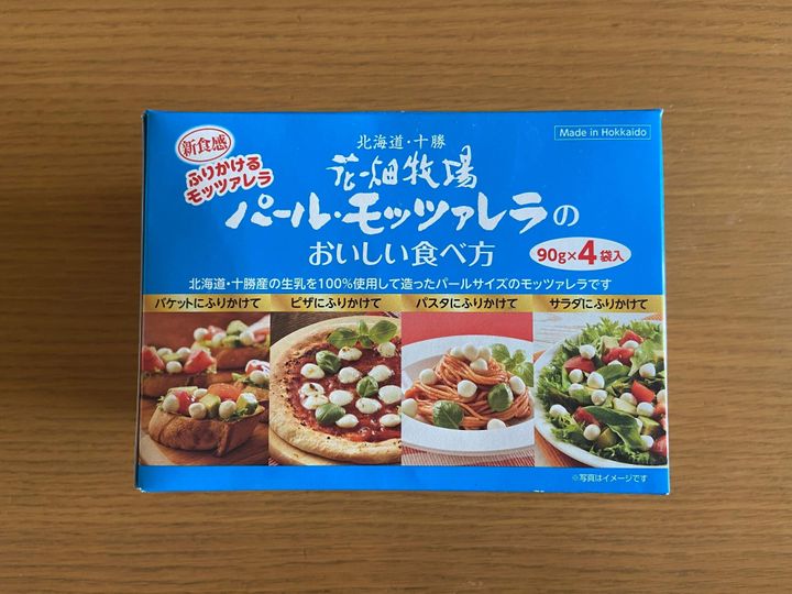 真珠サイズの小さなモッツァレラチーズが90g入ったパウチが4袋入り。北海道・十勝産の生乳を100%使用したモッツァレラチーズとのこと。