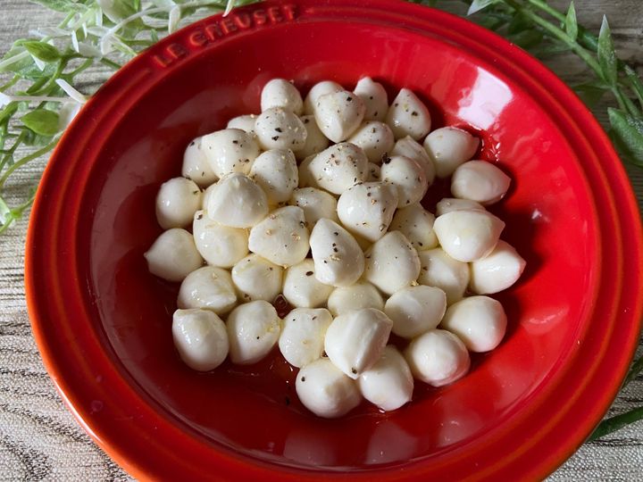 とってもかわいい小粒なモッツァレラ!そのまま食べるとミルキーな味わいの中にほんのり塩気がありおいしいです!