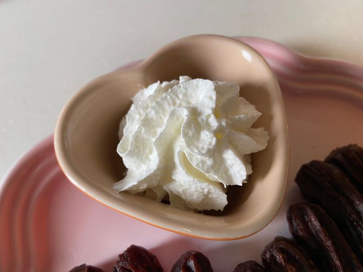 250g入りですが、約1000gほどのホイップが出るとのこと。こちらもふんわり軽いくちどけで味はアマンディホイップより少し甘め。使い道はアマンディホイップと同様に、いろいろなものにトッピングしていますが、業務スーパーで販売されているビターテイストなチョコチューロスに特によく合いました。