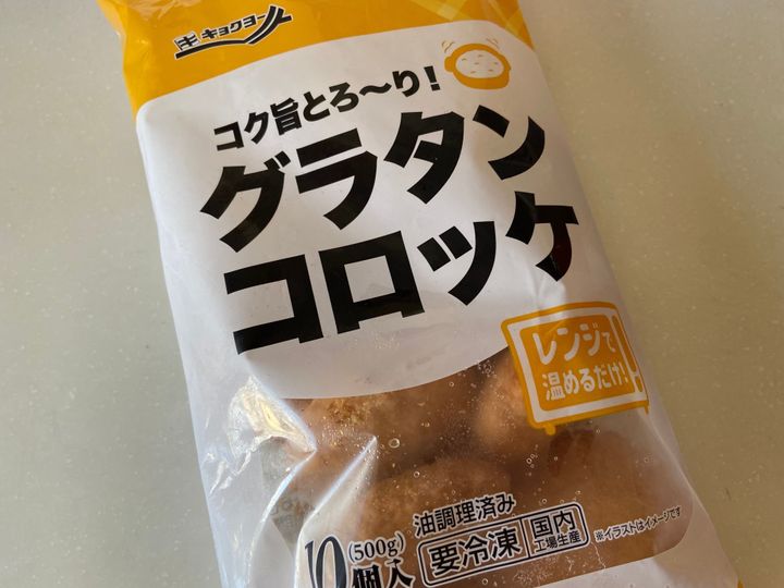 黄色いパッケージのほうは「グラタンコロッケ」。玉ねぎ、とうもろこし、マカロニなどが使用されています。
