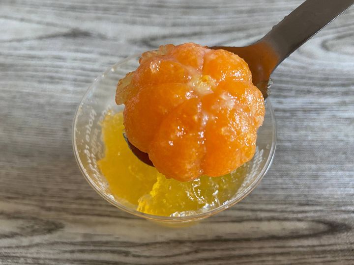 ごろっと丸ごと!このインパクトはすごいです。少し小さめの愛媛県産みかんが1個入っていて、フレッシュな甘酸っぱさがたまりません。たっぷり大容量のカップ入りスイーツですが、全体的にみかんの果汁をしっかり感じられる自然な甘さになっているので、暑い時期にもぴったりで食べやすいです。