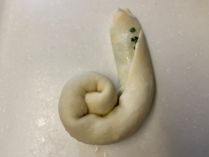 ロール状になったらさらに渦巻き状に巻いていきます。巻き終わりを渦の中央部分に差し込んだら、巻いた生地を麺棒で軽く押しつぶしながら伸ばします。