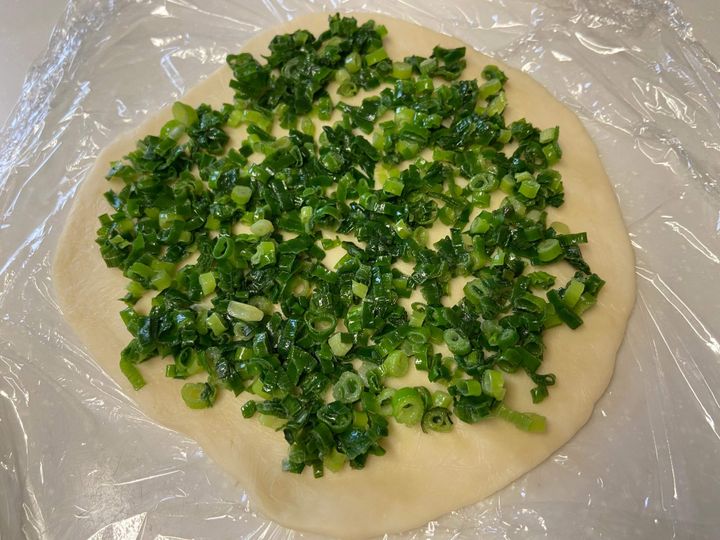 丸く平らに伸ばした生地にサラダ油を薄く塗り、葱をのせます。葱が好きなのでパッケージに掲載されている量よりも多めにのせました。