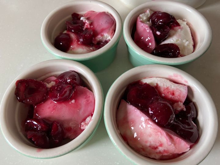 大き目のスプーンですくってみるとチェリーソースの下にはババロアが。きれいにカットすることは難しいので、カップに取り分けていきます。