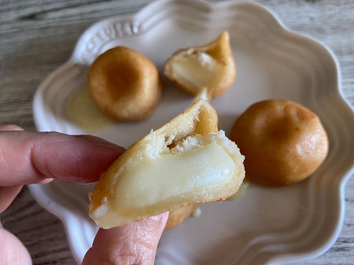 中からチーズが飛び出してしまったものもありますが...食べてみると予想以上にもっちもちの生地がおいしい!もち米や米粉が使われているほんのり甘い生地の中にはとろ~りクリームチーズが。