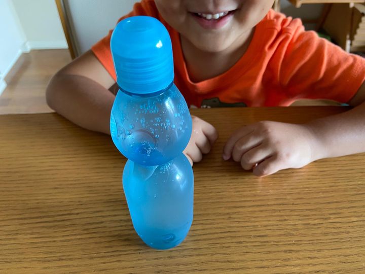 ピンクのキャップをグッと押し込み、ビー玉が落ちてシュワっとなる瞬間がまたたまらない!子どもたちもテンションがあがる瞬間です。