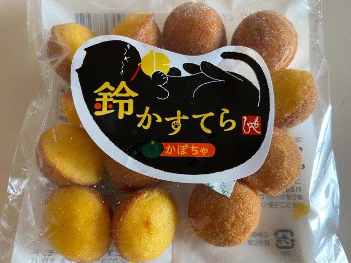 鈴かすてらは以前も購入したことがありますがこのかぼちゃ味は初めてです。鈴を持った猫がごろんとくつろいでいるパッケージのイラストがとってもかわいいですね。