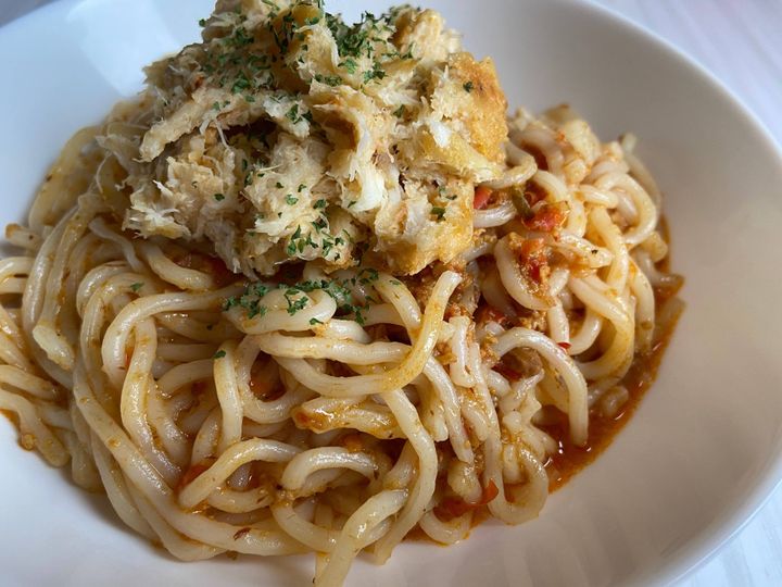 この時はたまたま蟹の身をトッピングできましたが、シーフードミックスなどをのせても。旨辛でスパイスの効いた味でボリュームも満点です。