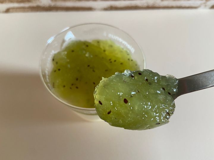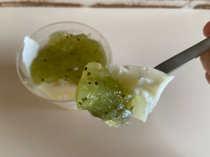まずキウイジュレから食べてみると、キウイのフレッシュなおいしさがたっぷり詰まったおいしいジュレです。ほどよい酸味とぷるぷるの食感がとても心地良い!