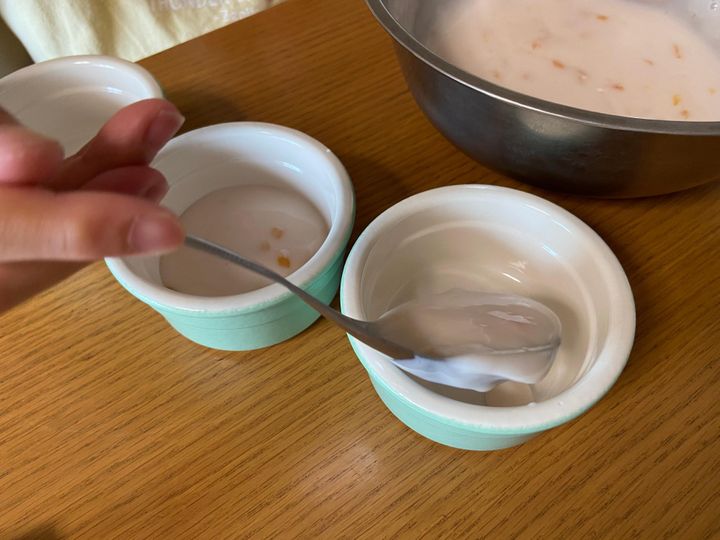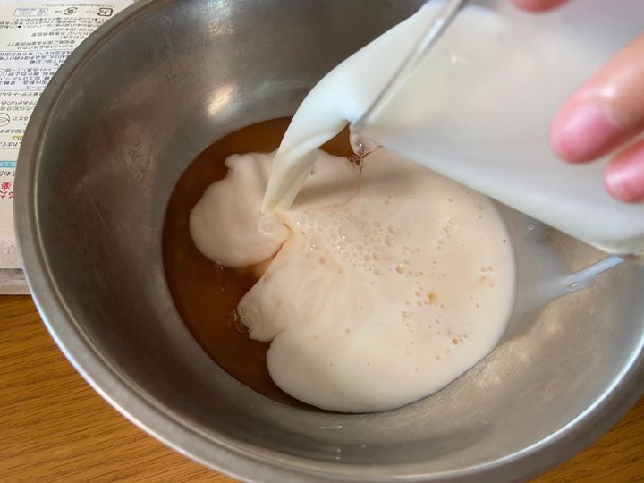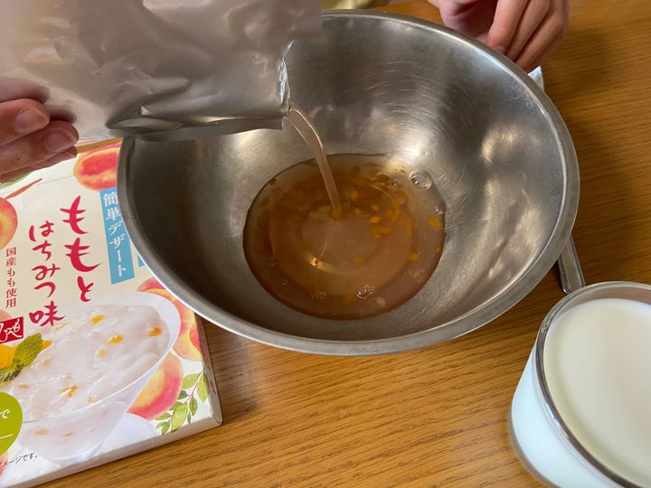 「牛乳でつくる簡単デザートももとはちみつ味」(購入時:198円)は、その名のとおり冷たい牛乳を注いで混ぜるだけでできるデザートです。