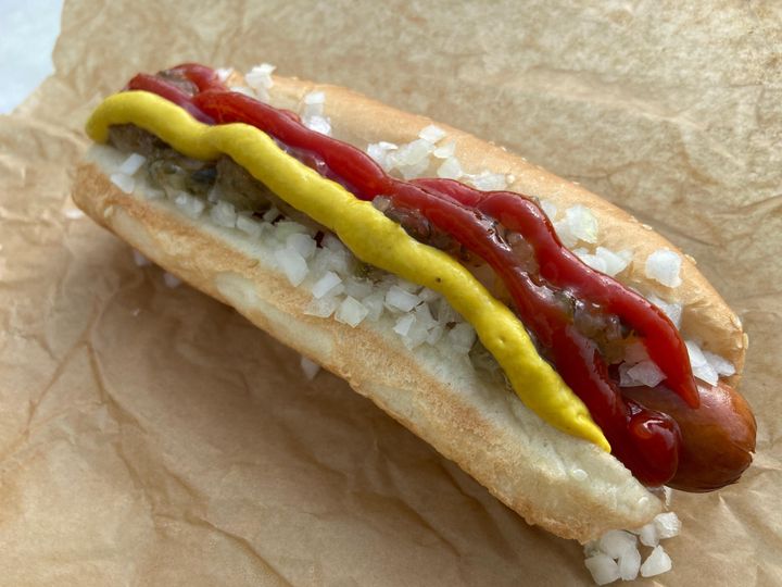 コストコフードコートの名物「ホットドッグ」(購入時:180円)。大きくて食べ応えのあるフランクが一本ドーンとパンに挟まれていて美味しいと大人気。
