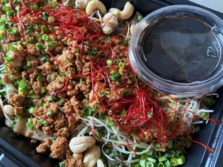 ひき肉にネギ、糸唐辛子、カシューナッツがたっぷりのっておいしそう。