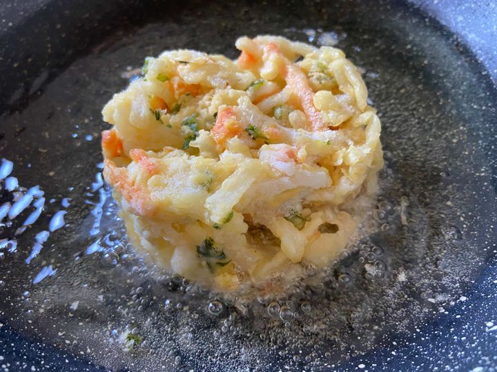 いつもフライパンで少な目の油で揚げ物をしている我が家。かき揚げが高さがあってボリューム満点なので、できればたっぷりの油で揚げたほうが良さそうです。筆者は数回ひっくり返しながら、揚げました。