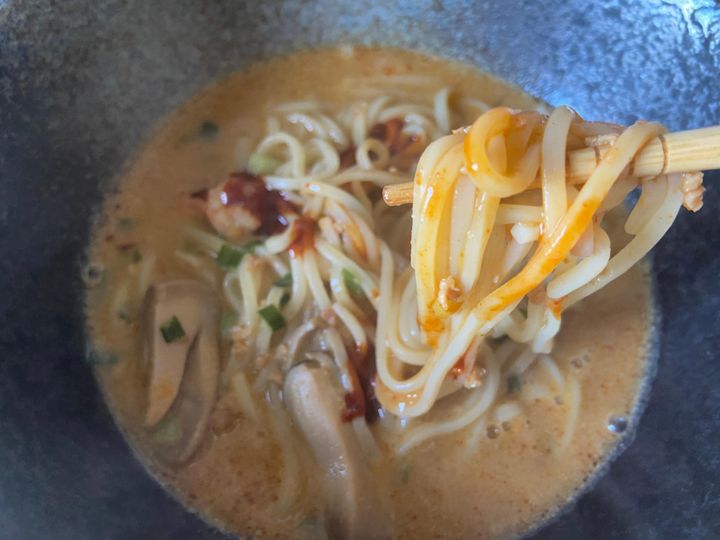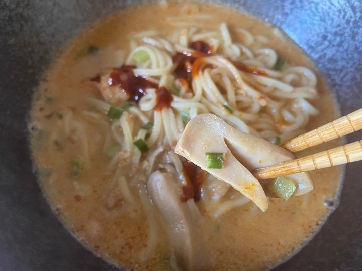 さっそく食べてみるとスープが豚骨の濃厚な旨みもありつつ酸っぱ辛いトムヤムクンの味わいもしっかりで、初めての組み合わせだけどとってもおいしくてやみつきになる味。ふくろ茸も入っていて具材も本格的。