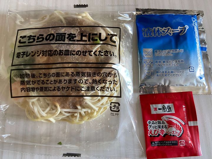 電子レンジ調理なのでとっても簡単。鍋で作ることもできます。「こちらの面を上にして」と書いてあるほうを上にして耐熱皿にのせて電子レンジで加熱、その間に熱湯でスープを溶かして作っておき加熱後の麺とえび辛ペーストをのせれば完成!