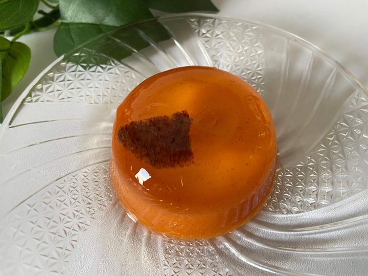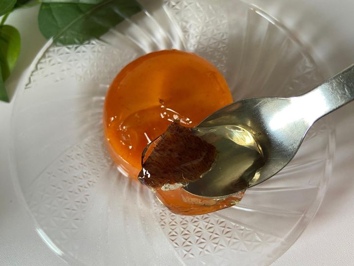 柿とゼリー部分を食べてみました。もっちりぷるぷるの食感でほんのり柿の風味がします。柿はシャキッとした食感。