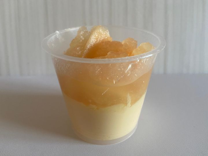 一口大にカットされたオレンジシュガーメロンは3つ入っていて、淡い色をしていますがしっかり熟して甘みがあります。メロンのやさしい甘みのジュレはふるふるの柔らかい食感。