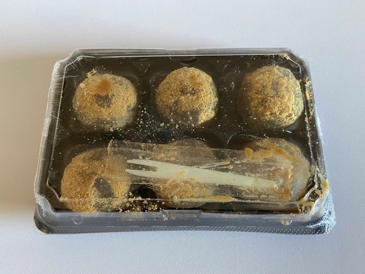丸いわらび餅にきなこがかかっています。ひとくちサイズより少し大き目で6個入り!