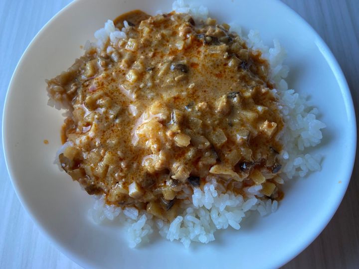 加熱後はご飯の上にのせて、あっという間に胡麻味噌坦々丼の完成!胡麻の濃厚な香りがたまりません。