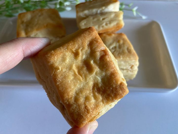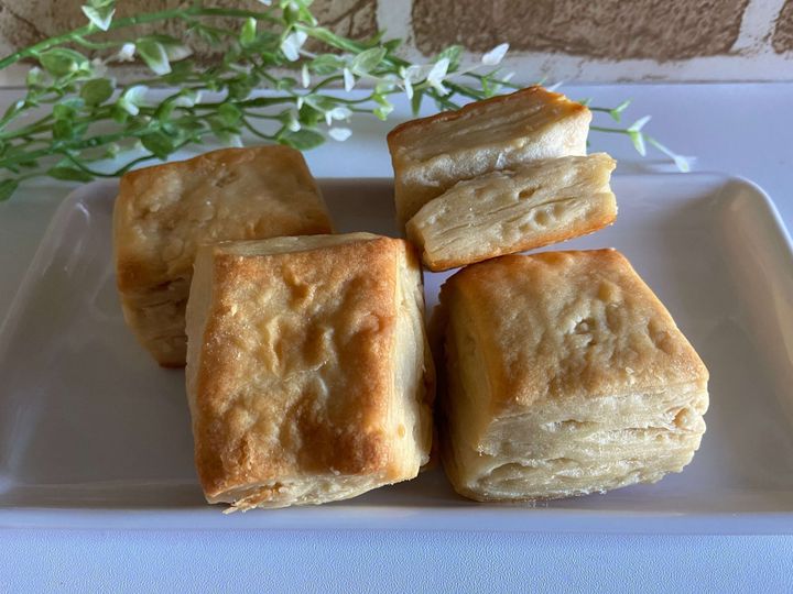 四角くきれいにカットされて焼き上げられたスコーンが4個入り。袋をあけた時点でメープルの香りがふわっと広がり、しっかり層のある美しい見た目にも癒されます。
