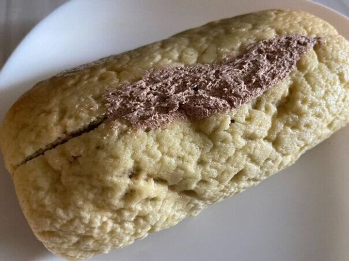 ほんのりチョコ風味のパンにメロンパンの皮をのせて焼き上げ、チョコホイップをサンドしたスイーツパン。これもずっしりと重みがあります。