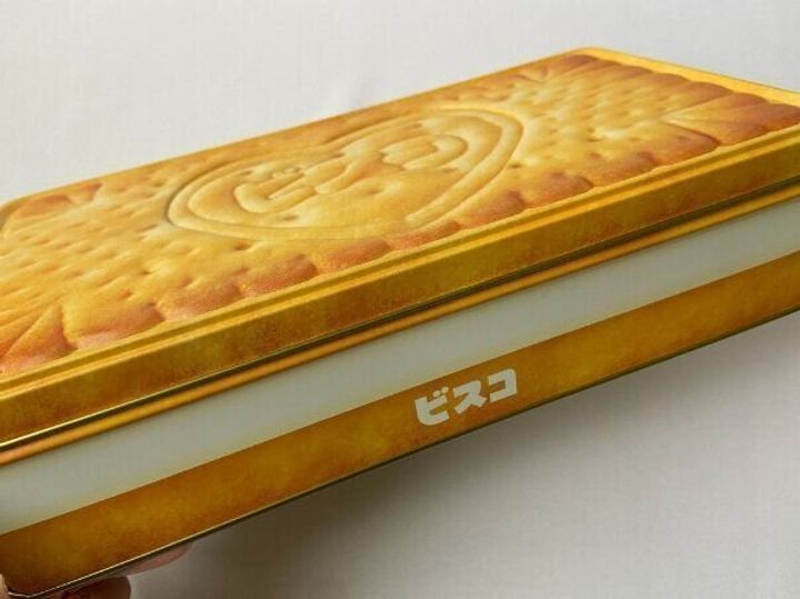ビスコのビスケットの模様や、サンドされているクリームまで再現されているビスコ缶!