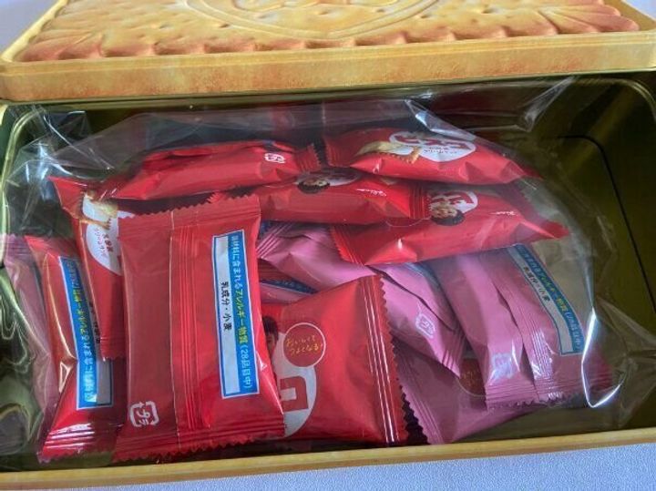 大きなビスコ缶のフタを開けると、中にはみんな大好きおなじみのビスコがたっぷり。