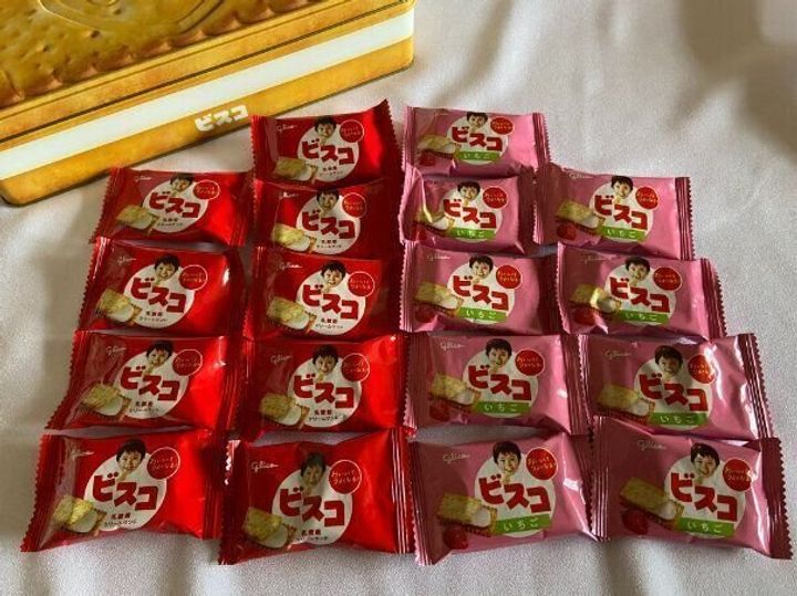 ミルクが9パック、いちごが9パックで、計18パック入っていました。1パックにはビスコが2枚入っています。