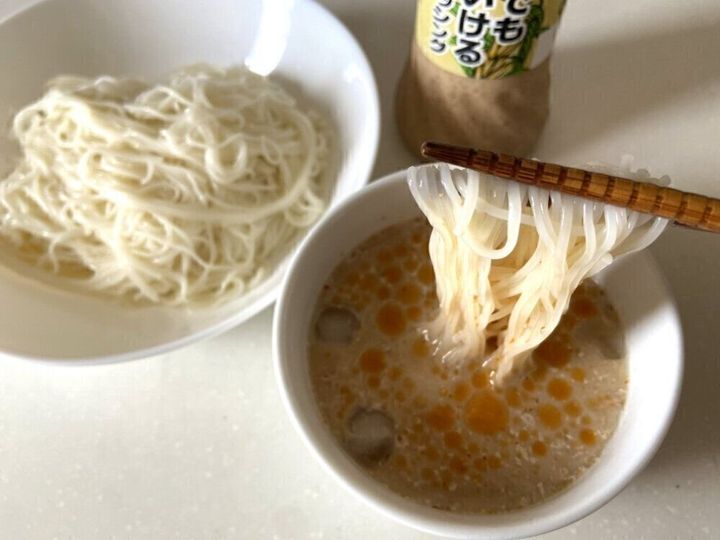 めんつゆ+胡麻ドレッシング+辣油を混ぜただけのつけつゆが、驚くほどおいしい!