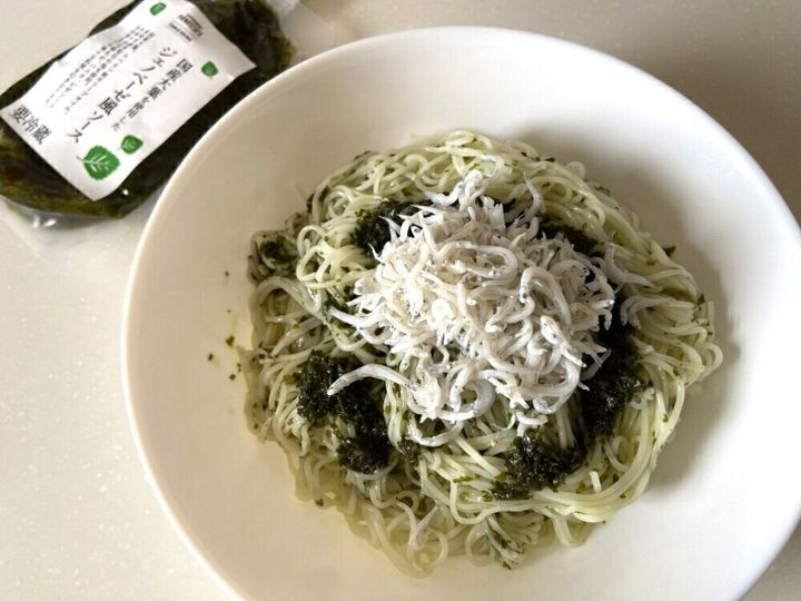 茹でたそうめんにジェノベーゼ風ソースをたっぷり絡めてしらすをトッピング。