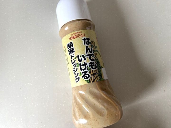成城石井には魅力的なドレッシングが数多く販売されていますがその中で断トツの売り上げを誇る人気商品がこちら「なんでもいける胡麻ドレッシング」(購入時:572円)。