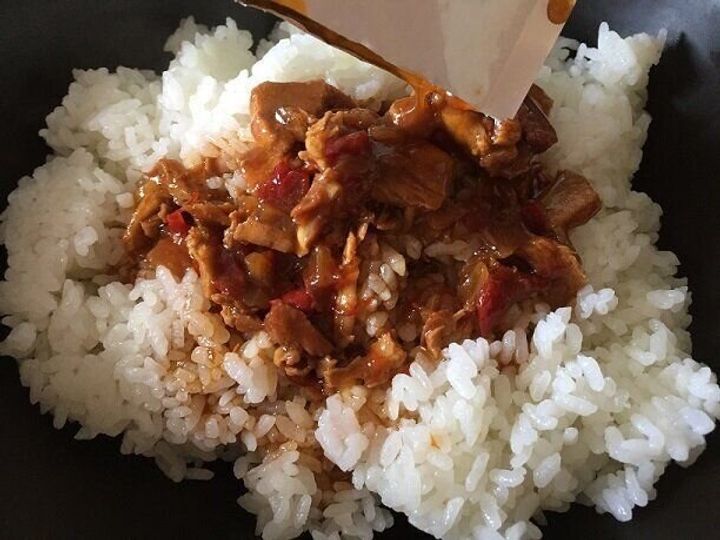 炊きたてご飯にナシゴレンの素を入れ混ぜます。お肉もごろっと入っていて、とってもいい香り!