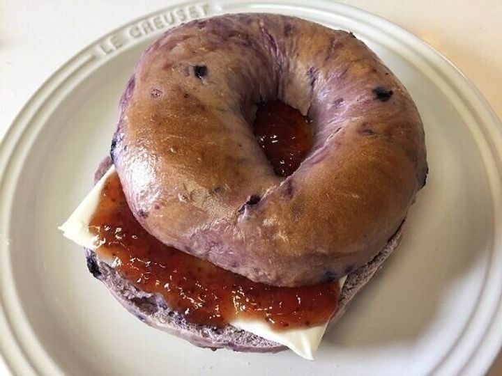 もちもちのベーグルにジューシーなブルーベリー、チーズと苺ジャムとの相性も抜群、腹持ちもいいので朝から元気になれるベーグルサンドです。