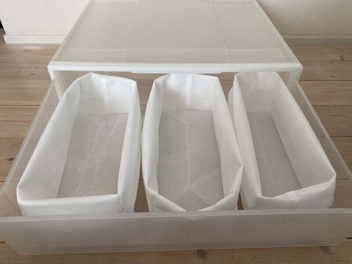 引き出しの中に色んな種類を混ぜて何でもポイポイ入れてしまうと、中身がごちゃごちゃになり取り出す時に欲しい服を見つけ出すのに苦労することも。収納作りのゴールは、「モノの住所を決めること」なので、住所がすぐにわかるように引き出しの中を仕切ってみましょう。仕切っておくことで、取り出す時もすぐに欲しいものが取り出せて時短になりますし、戻す時もその決めた場所に戻すだけ、と毎日の片づけもラクになります。我が家は、セリアの「整理収納仕切りケース」を使って仕切っています。