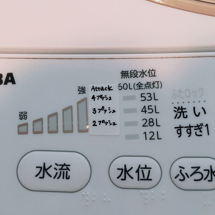 パッケージを剥しても何プッシュ入れるとよいかわかるように、我が家はマスキングテープに書いて、それを洗濯機に貼っています。そうすることで、すぐに適量がわかり、時短に繋がります。そして、誰にでもわかりやすくしておくことで、家族も手伝いやすくなり、家事シェアができてママもラクになっていきます。