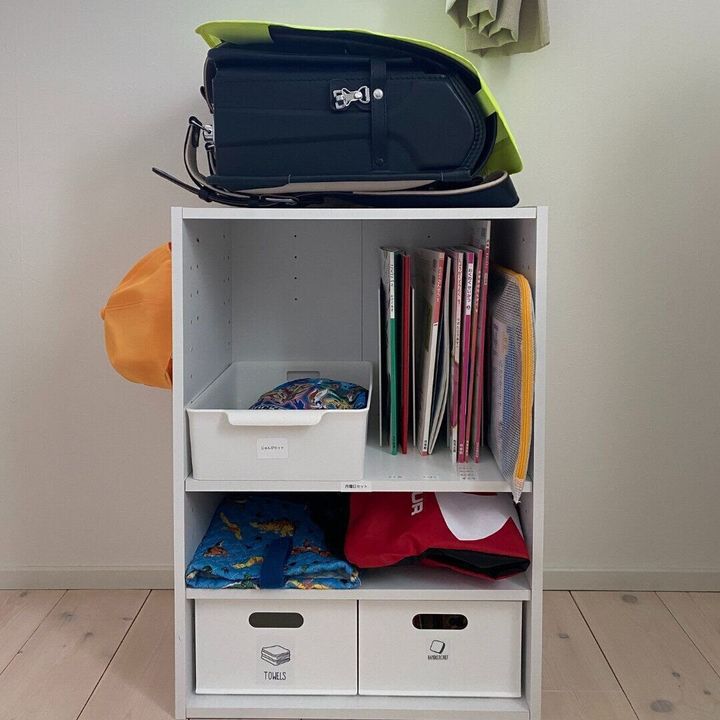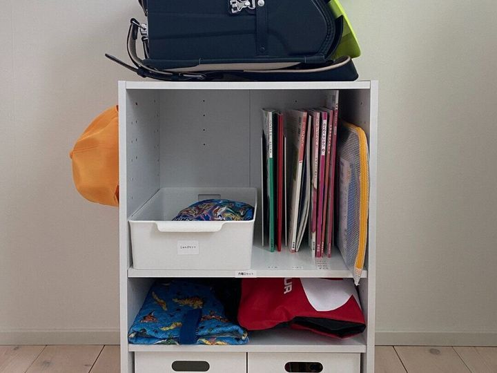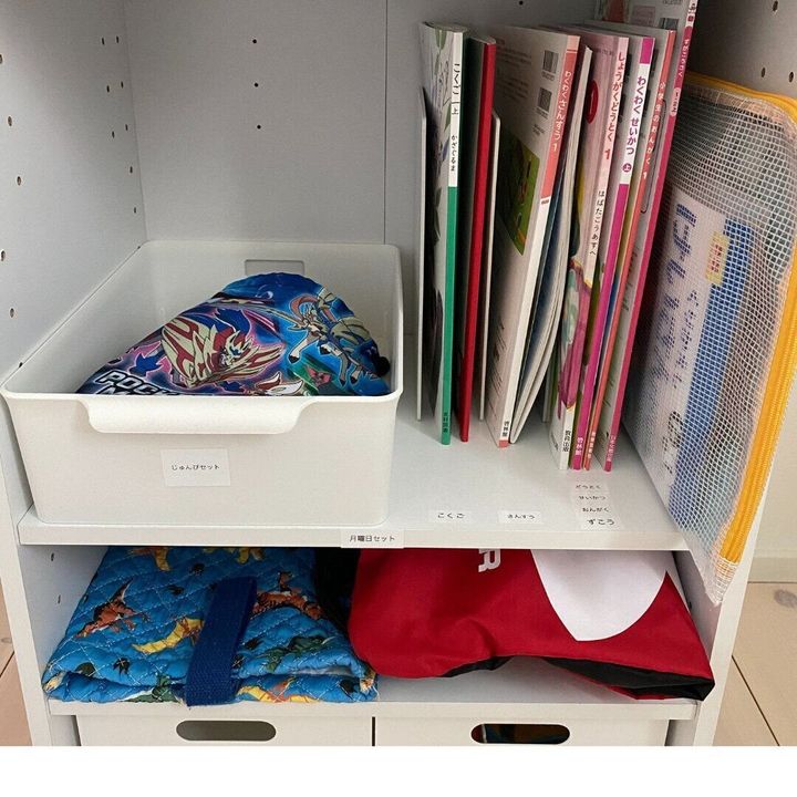 毎週末持ち帰る体操服や上履き、歯磨きセットなど、平日は家にないものの場所も事前に場所を決めて確保しておきましょう。我が家は、「月曜日セット」として教科書の下の段にスペースを確保しています。確保していないと、洗濯後置き場所がなくて机や床に転がったままになったりすることも。スペースを確保しておくだけで、洗濯後そこにしまっておくと見た目にもすっきりしますし、忘れ物防止にもなりますよ。