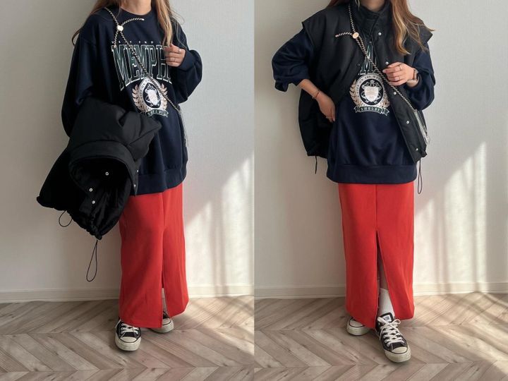 話題で大人気だったカレッジロゴスウェット、筆者も迷わず色違いでゲットしたのでコーディネートも合わせて紹介させていただきます♪