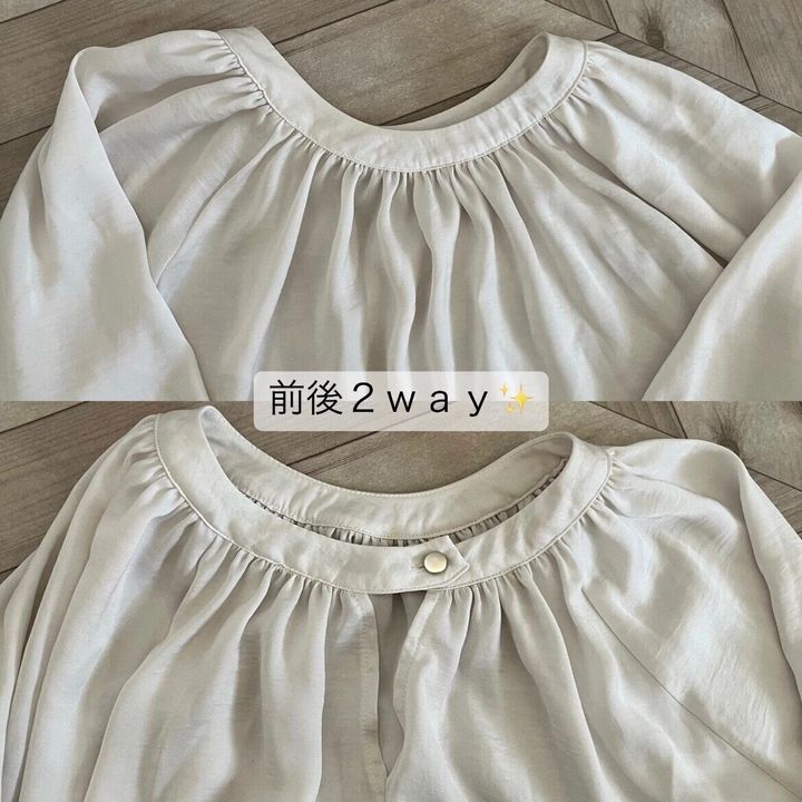 ギャザーが入ったシンプルな面と、ボタンをとめたようなデザインの面があります。後者は逆三角形に肌見せする部分があるのでこなれ感を演出できます。