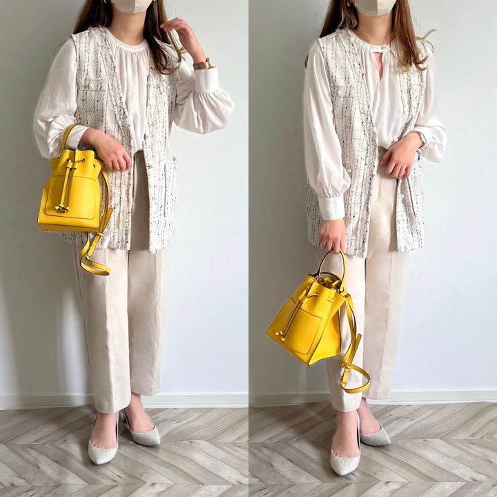 パンツを同系色にしたのでバッグにカラー物を持ってきましたが、春らしいカラーパンツにシンプルなホワイト系のバッグをもってきても素敵だと思います。パンツはピンク、イエロー、ブルーやグリーン優しい色味であればなんでも合います♪