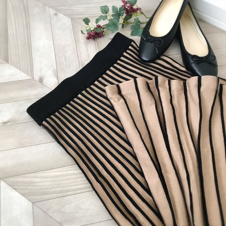 こちらはベージュと黒の配色のニットプリーツスカートです。