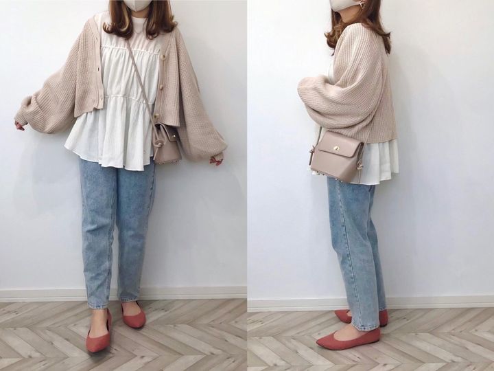 ティアードシャーリングブラウスと合わせて、全体的に淡色アイテムで合わせて足元は濃いめピンクのフラットシューズにして、春コーデを意識してみました。