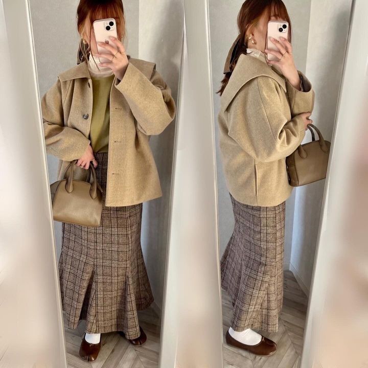 ビッグカラーのお洋服はものによっては子どもっぽく見えてしまうときがありますが、こちらは色味も落ち着いているので挑戦しやすいまさに大人可愛いコート。