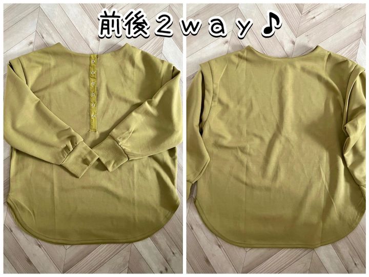 個人的な感想なんですが、赤ちゃんを抱っこすることが多い私にとってはこの生地は本当にありがたいです。服と頬が密着するので、例えばニットだと赤ちゃんの肌への影響がどうしても私は気になってしまうんですが、こちらはもちっと柔らかい肌触りなので安心して抱っこをすることができます。赤ちゃんとお出かけするときはボタン側を後ろにして着ます♪