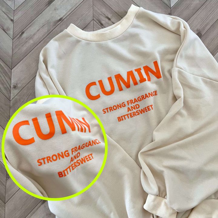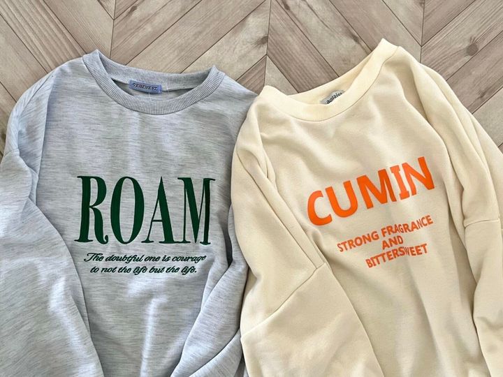 こちらは淡いクリーム色の生地にパキッとしたオレンジのロゴが目を惹くスウェットです。