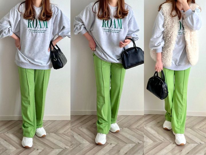 ロゴのグリーンに合わせて黄緑のカラーパンツを合わせてみました。