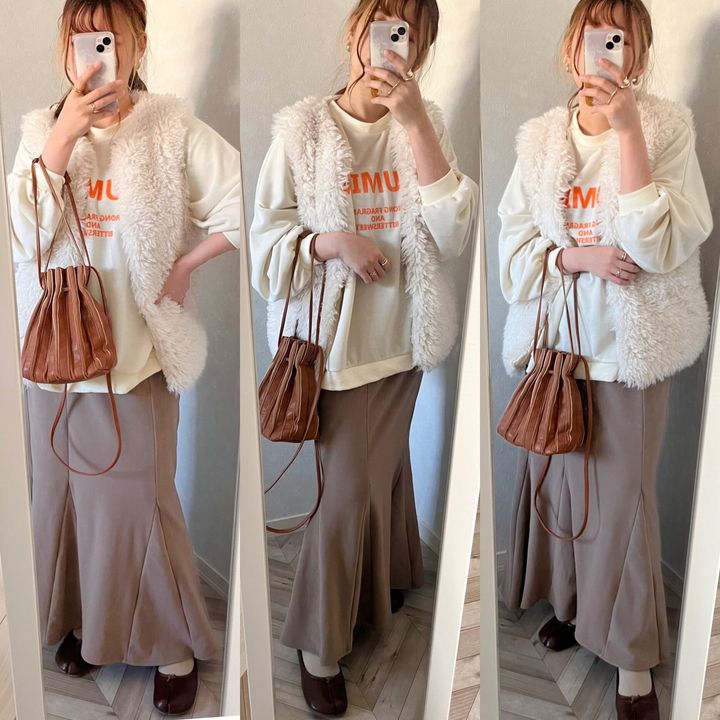 トレンドのファーベストとマーメイドスカートを合わせて淡色コーデにしてみました。