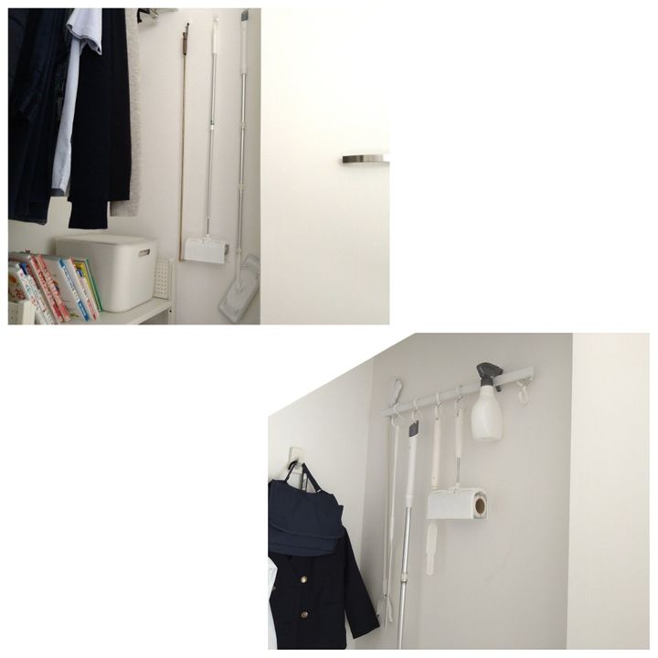 自立するのでそのまま立てかけて収納しても問題ありませんが、私が収納する時のこだわり「空中収納」。階段下と寝室のクローゼットにフックに吊るして収納しています。