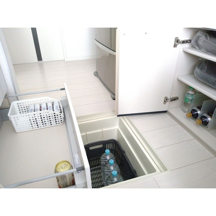 冷蔵庫に近い引出しや床下収納、カップボードに飲料ストックを収納し、冷蔵庫への補充がスムーズに。