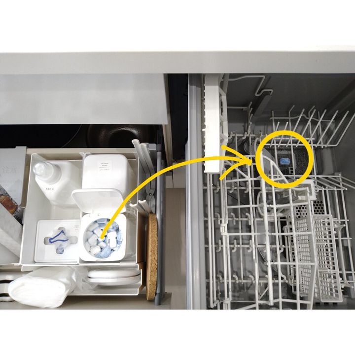 食洗機洗剤は食洗機横、シンク下の引出しに収納しています。使う場所の近くに収納することが1番ですよね。洗剤を計量不要のタブレットタイプにすることでさらにラク家事になりました。